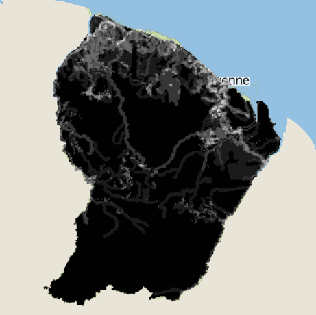 Donnée millésimée 2005, issue de l’étude ” HUMAN FOOTPRINT” Guyane : Réalisation de couches cartographiques représentant l’indice d’empreinte humaine sur la Guyane Française entre 2005 et 2019.