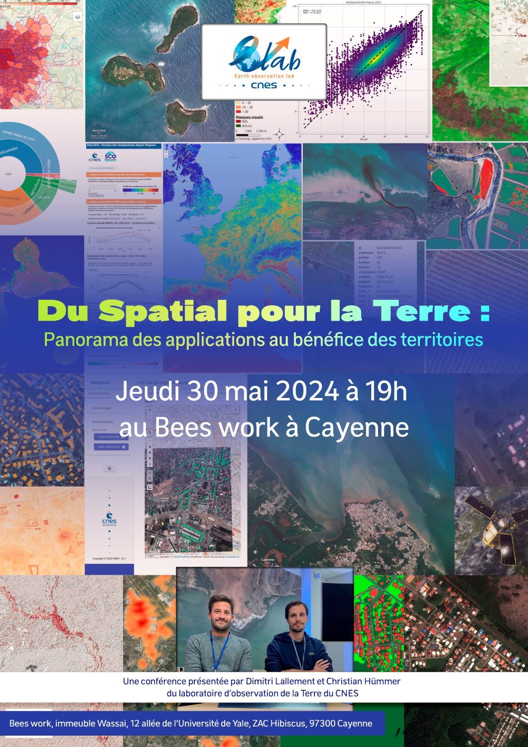 Le CNES a organisé une conférence (tout public) sur le thème des applications spatiales, le jeudi 30 mai 2024 à 19h au Bees work - Cayenne. Elle était présentée par Dimitri Lallement et Christian Hümmer du laboratoire d'observation de la Terre du CNES.